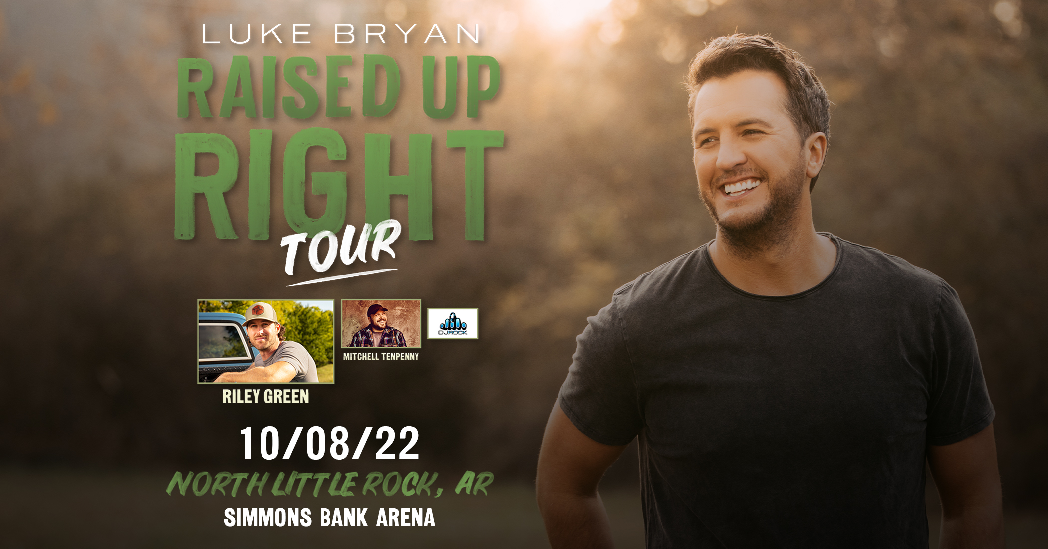 Luke Bryan Raised Up Right Tour 2022 with special guests Riley Green, Mitchell Tenpenny and DJ Rock live at Simmons Bank Arena in North Little Rock, Arkansas on Saturday, October 8th, 2022 at 7pm.